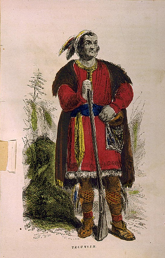 Tecumseh had instructed his warriors to carry only Indian weapons and to wear only native dress to show that they relied solely upon the Indian ways. While Tecumseh was dressed in a simple fashion his group of 30 or so followers dressed in a ‘fantastic fashion’ with eagle and hawk feathers in their hair and buffalo tails jutting from the back of their belts as other tails and hawk feathers protruded from their arms.Their bodies were painted black, red semi-circles and slashes were beneath their eyes and across their cheekbones, They had red circles on their foreheads and red jagged lightning bolts streaked down their arms and legs. Their heads were shaven except for three braided scalp-locks that hung down their backs. The entire composition was accentuated by a large red circle upon their chests.