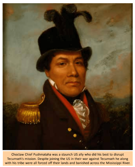 Despite their vocal and strident support for the Americans both Pushmataha and Nunnehidihi, like some of Tecumseh’s own Shawnee that also supported the US, were later forcibly removed and betrayed by the US Government’s Indian Removal Act. Nunnehidihi along with his son were eventually assassinated by their fellow Cherokees for signing the Treaty of Removal leading to the loss of nearly all the Cherokee homelands.