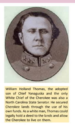 William Holland Thomas was later elected as a State Senator and through his business and political acumen he was able to protect his adopted people. Thus the Cherokee of Qualla, North Carolina successfully resisted the US Govt’s Indian Removal Act. Through the use of his own funds William H. Thomas purchased the land demanded from the Indians and then left it in the care of the Cherokee people. As a white man, Thomas could legally hold a deed to the lands and allow the Cherokee to live on them. Thus to this day the Eastern Band of the Cherokee people remain in their original ancestral homelands.