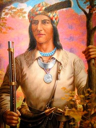Tecumseh, handsome, dynamic and bold was already quite an impressive figure. Now silhouetted by the great comet for which he was named at birth, decorated with body paint and a red headband, 2 crane feathers in his hair- one white for peace the other red in preparation for war, silver armbands and 3 silver rings hanging from the center of his nose, Tecumseh appeared magnificent and inspiring.