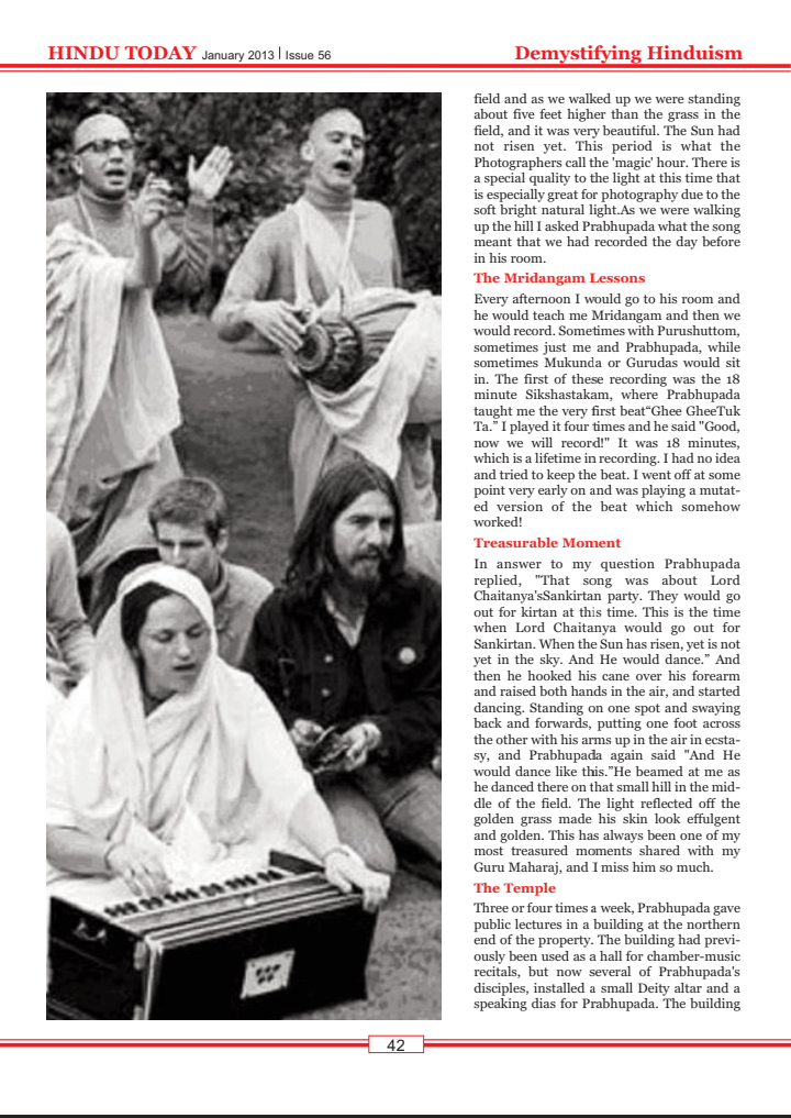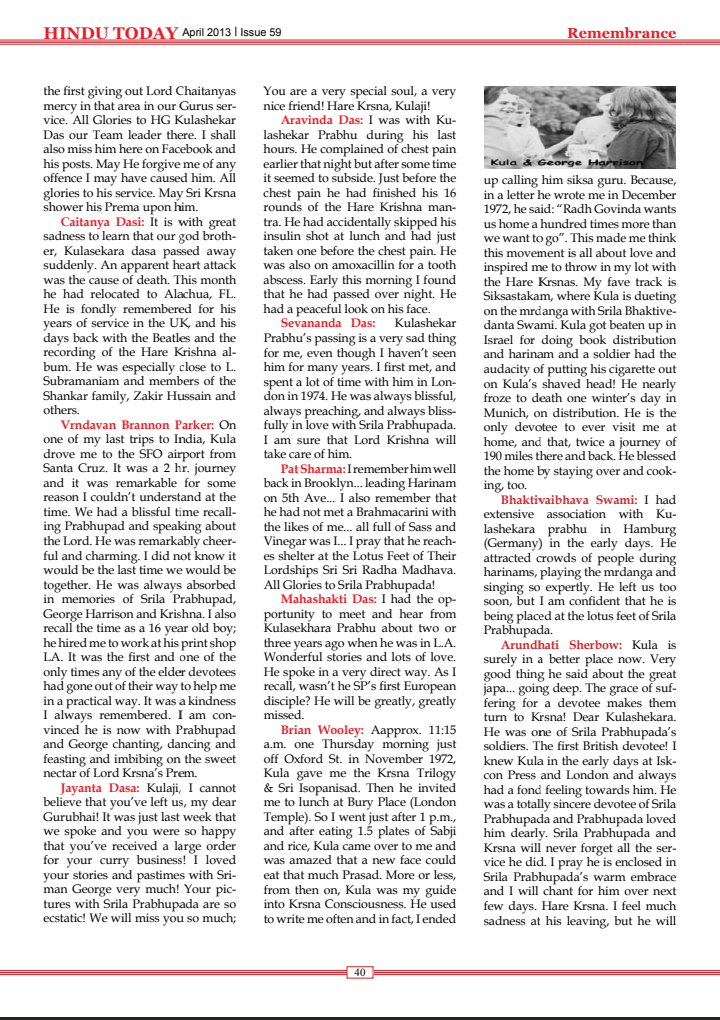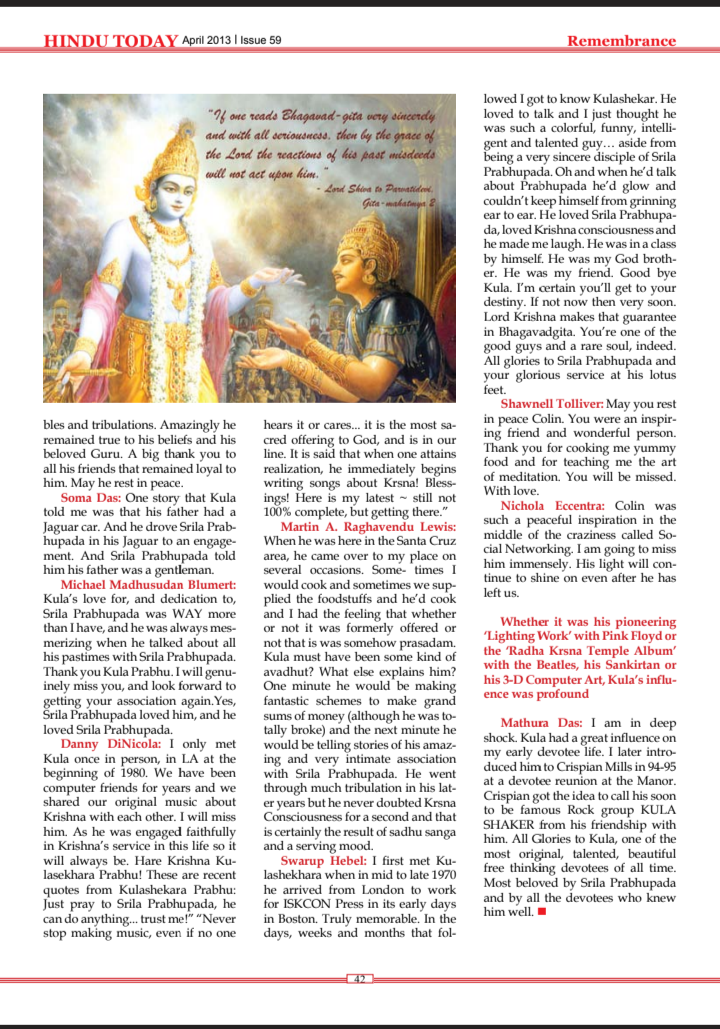 This article is also rare for it represents the one and only ever published by the author. He personally told me this was intentional. He said he wanted to save his story for an intended book. He in fact only agreed to publish this article as a favor to me, “a younger God brother Gurukuli veteran starting on a potentially promising new gig.” It was Lord Krsna’s Grace, for a month after publication, Colin Jury/Kulashekar left this world to join his beloved Srila Prabhupad and Sri Sri Venkateshwar. Hindu Today’s tribute to Kulashekar follows his article. BP