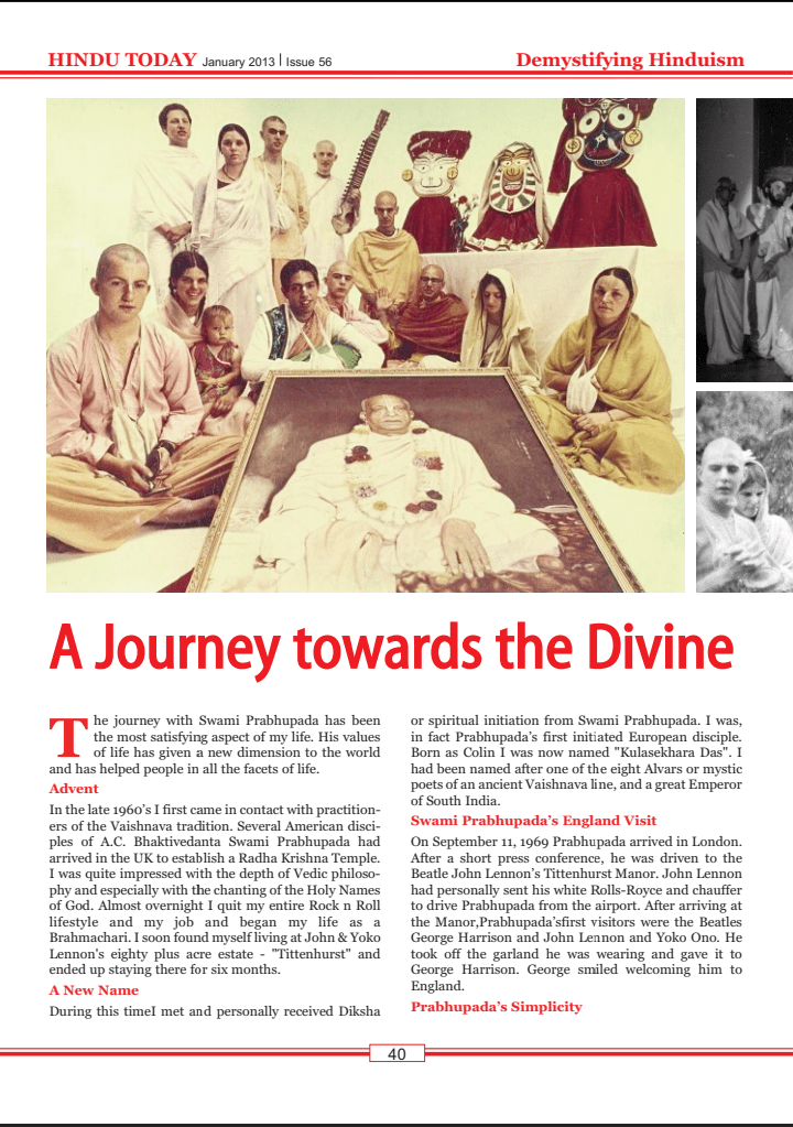 “This article, published in the January 2013 edition of UK’s Hindu Today Magazine, represents a rare historic first hand account of Britain’s late 1960s popular cultural phenomenon. The intersection between ancient Vedic transcendence and the West’s vibrant 1960s cultural youth rebellion is of great historical significance. However the true dimensions and impact of this era remain unrecognized. Here, the author, Colin Jury/Kulashekar, Iskcon’s first British initiate, provides an intimate look into the era from the perspective of an active participant. Colin shares his role in those historic days with his Gurudev, Srila Prabhupada, the Beatles and his role in recording the ‘Top of the Pops” Radha Krishna Temple Album.