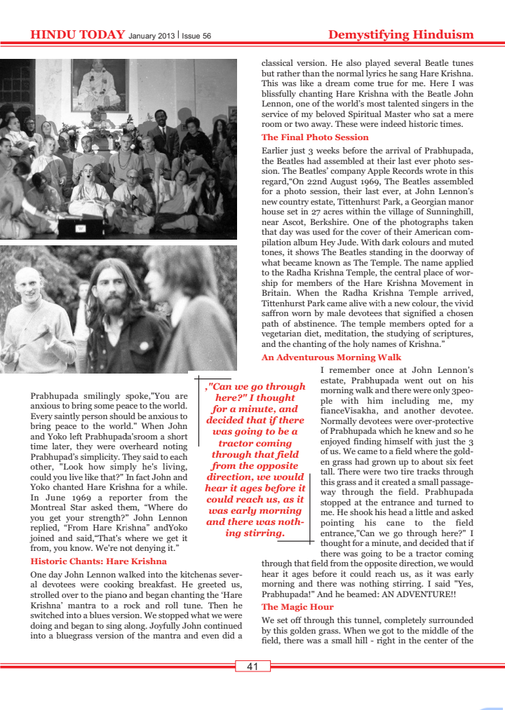 Note: The article was published during an Editorial transition period. Not wanting to skip a month, the edition was published despite being short-staffed. Thus the typos. The title and opening paragraph were not written by either the author nor myself. Also the picture of Yoko & John Lennon holding a much later Prabhupad picture is photoshopped.