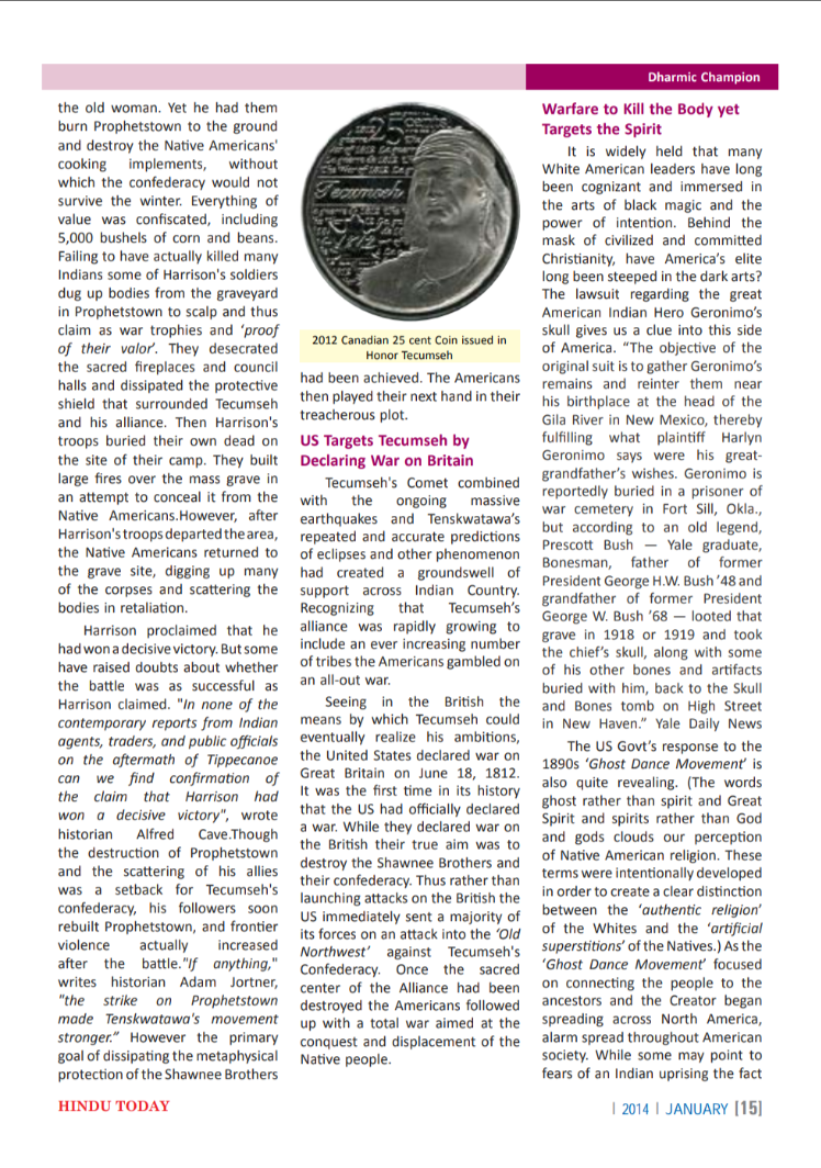 Through his scheming efforts millions of acres of American Indian land was being stolen and sold to white American families. His first goal was to populate Indiana with ‘civilized’ people in order to reach the threshold of 60,000, the required number for a territory to be recognized as a US State. Whites began brutally massacring Indians in a random manner. Harrison for his part in one instance sent his own Doctor to treat several Indian victims, not out of compassion but, as he explained, because, “Such instances exasperate the Indians and will prevent them from delivering members of their tribe who have broken our laws.”