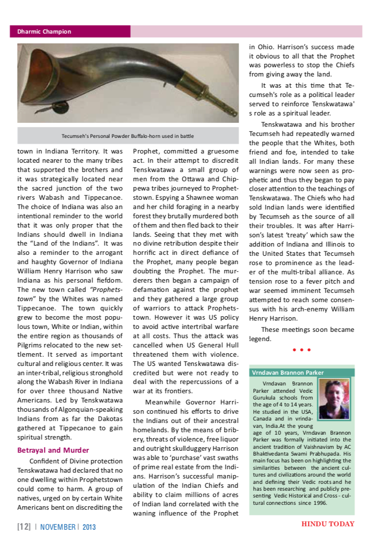 Such a jaundiced and prejudiced mentality was the order of the day.Cheeseekau, the mentor and elder brother of Tecumseh said it perfectly, “When a white army battles Indians and wins, it is called a great victory, but if they lose it is called a massacre. The white man seeks to conquer nature, to bend it to its will and to use it wastefully until it is all gone and then he simply moves on, leaving the waste behind him and looking for new places to take.” In such a setting Whites escaped punishment for their crimes against the Natives while Indians were frequently hunted down and executed for any crimes committed against the Whites. Gov. Harrison refused to apply the law equally to all but rather continually demanded the extradition of Natives at will. This led to a further breakdown in the relationship between Tecumseh and Harrison.